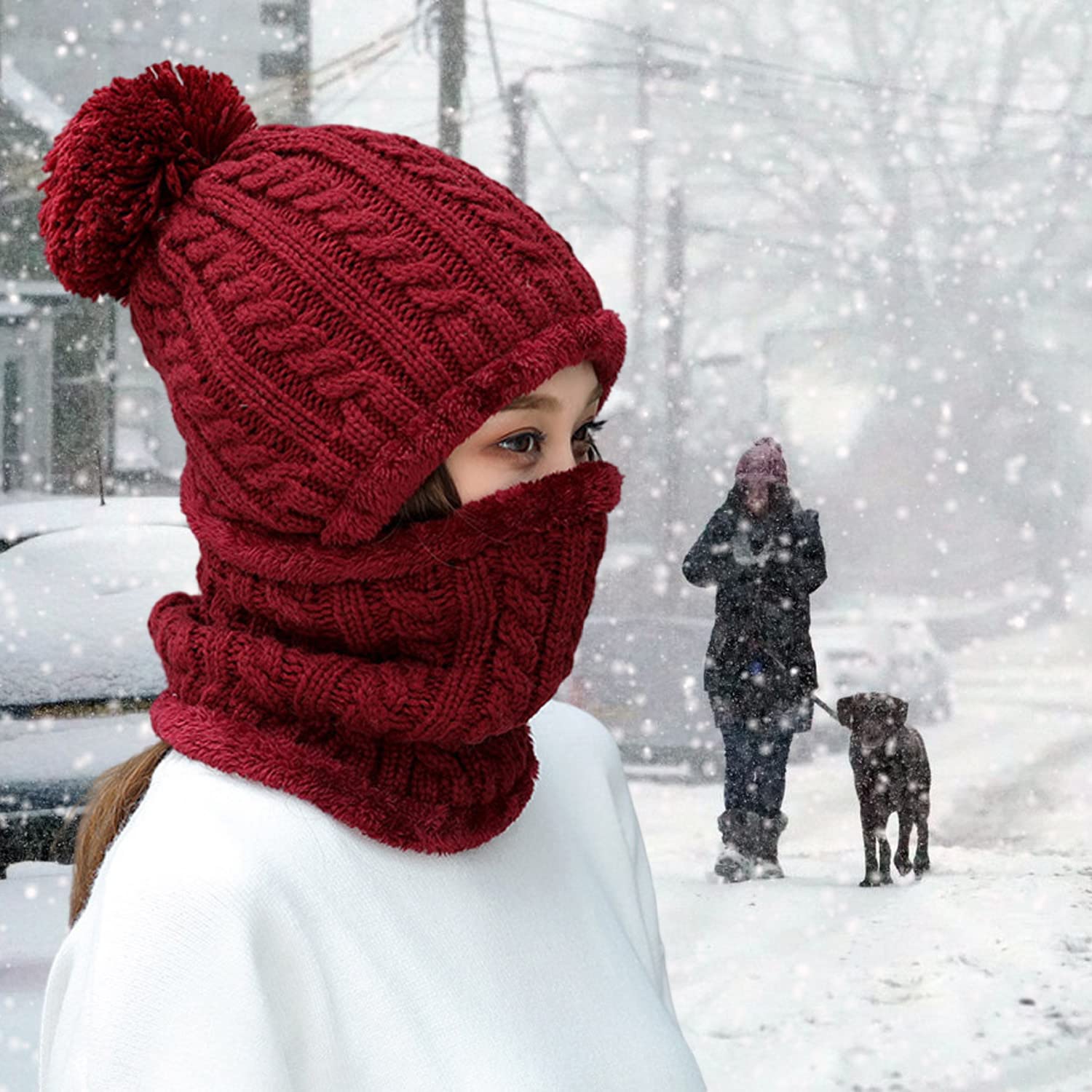 - One-piece Style: beanie hat + circle scarf, the beanie hat and the circle are connected,can not be devided seperately,full woolly fleece covered inside,