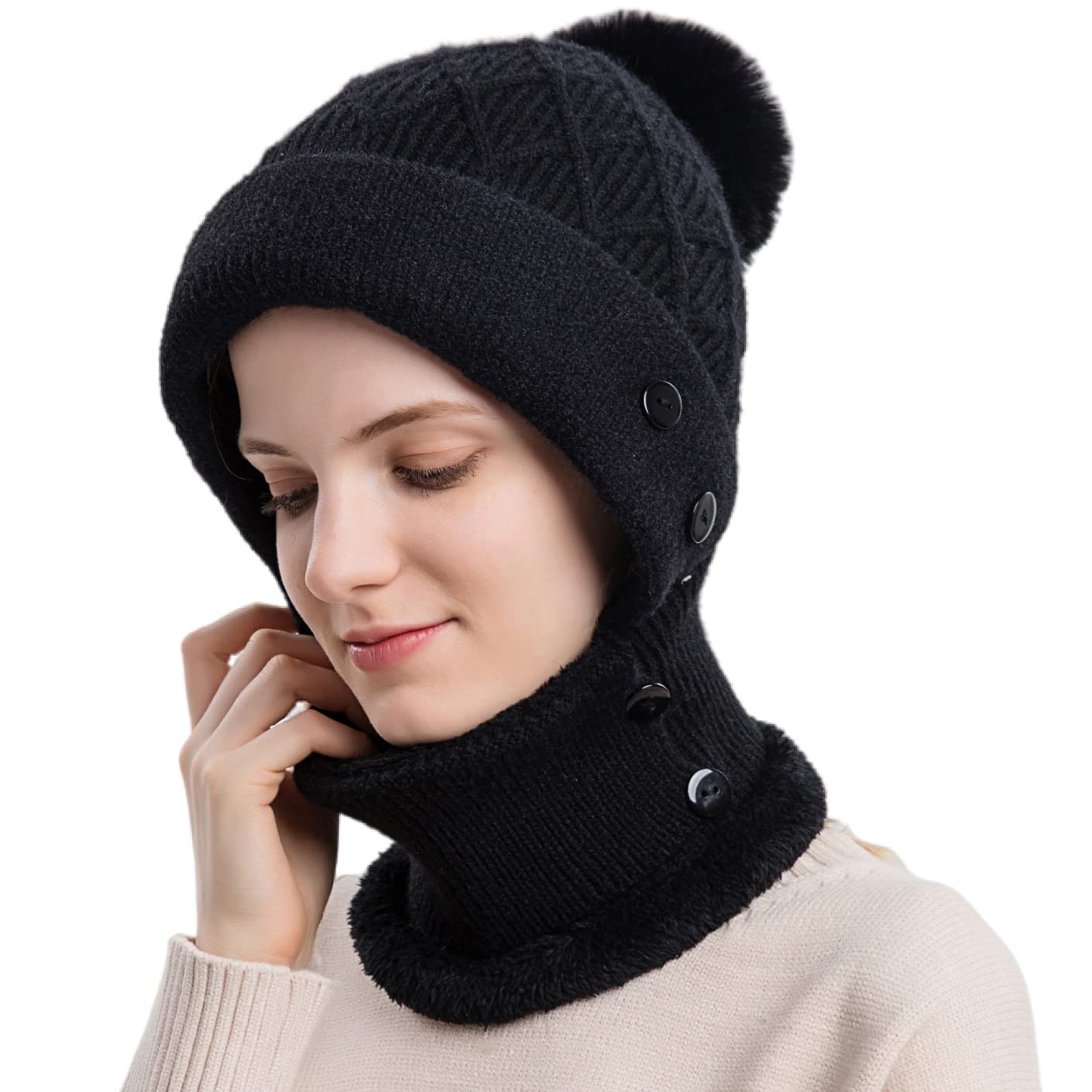 HUAMULAN Women Winter Beanie Hats One Piece Fleece Lined Knit Balaclavas Mask Set Skull Neck Circle Scarf Ski Snow Hat Pompom