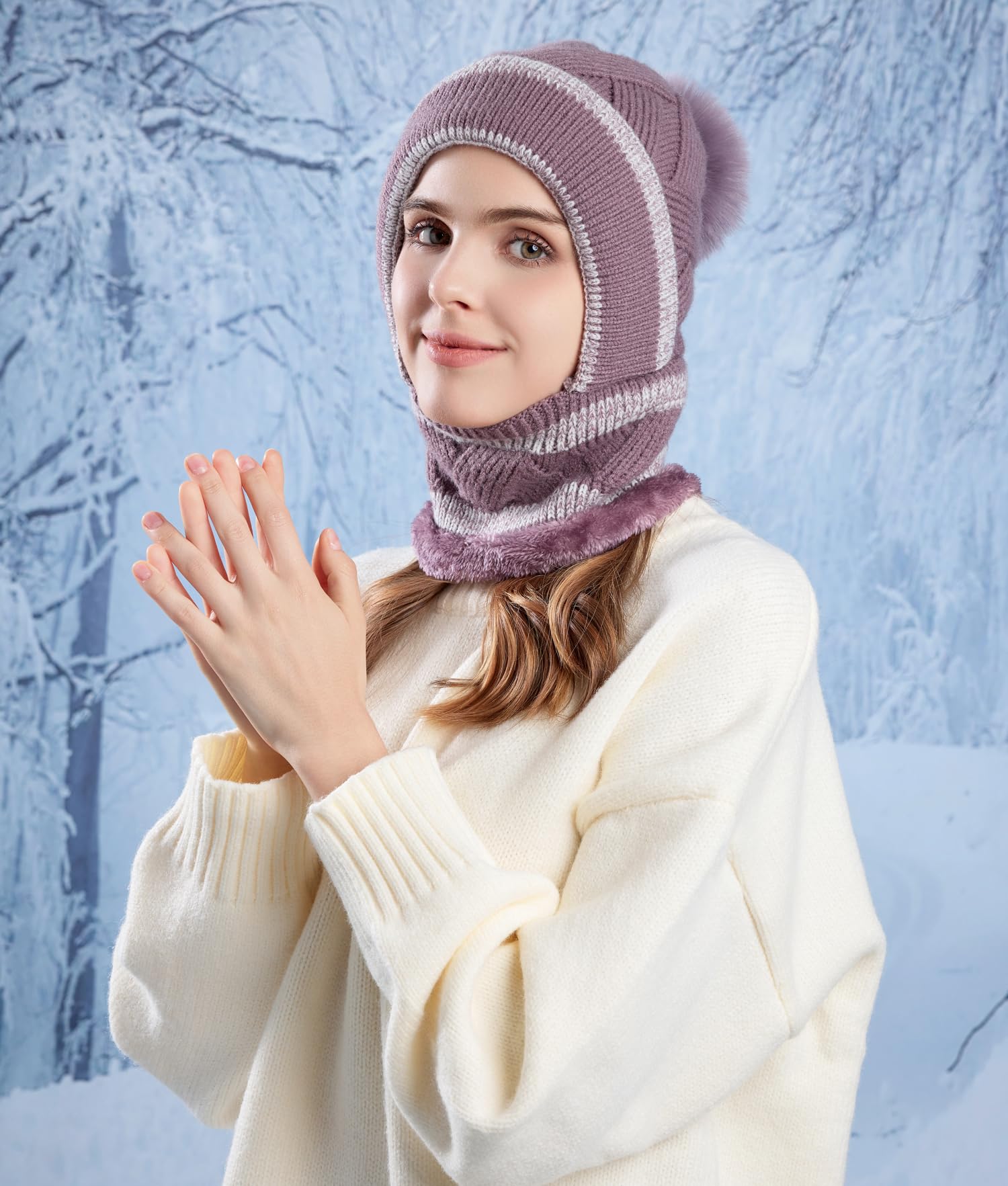 HUAMULAN Women Winter Beanie Hats One Piece Fleece Lined Knit Balaclavas Mask Set Skull Neck Circle Scarf Ski Snow Hat Pompom