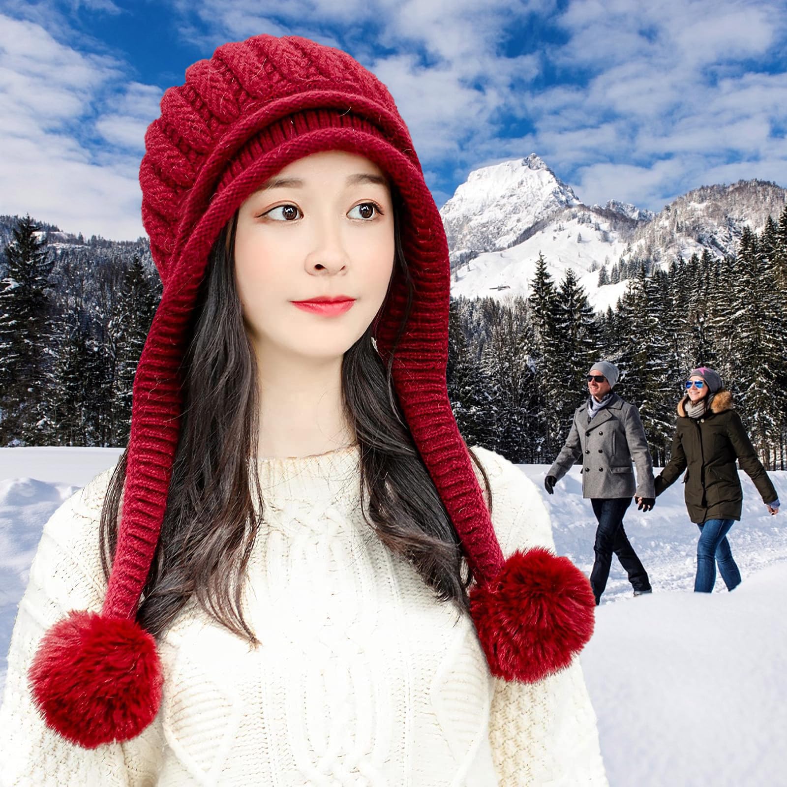 - Great Design: Acrylic knit beanie with earflaps for women with lovely 3 pom poms,1 top pom and 2 side earflap pompoms; there is a split in the backside, it is easy for ponytail wearing.In chilly weather, this hat will keep your ears well-guarded.
